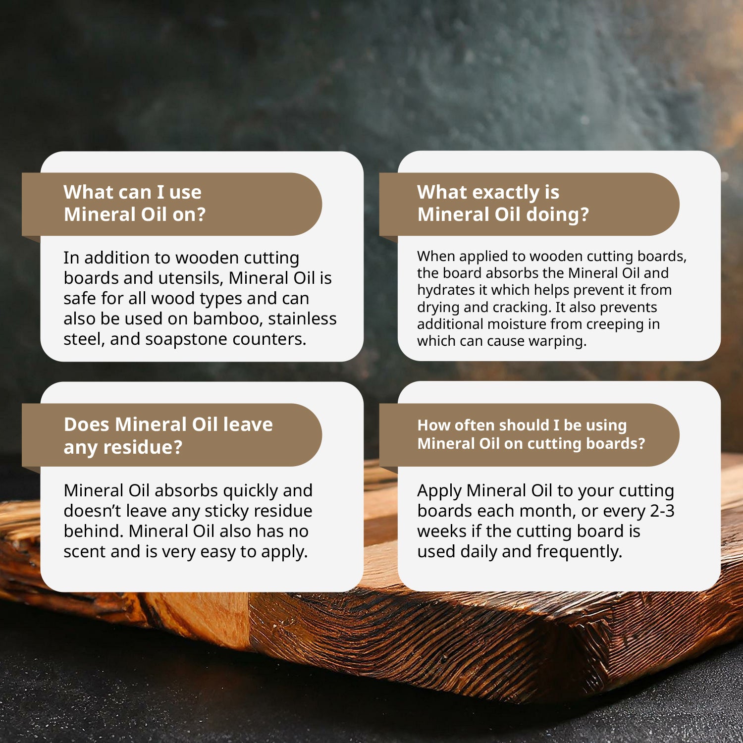 An easy and convenient way to protect your wooden cooking utensils and tools, our Cutting Board Mineral Oil features a light texture with a smooth feel that’s easy to apply and clean up. This amazing mineral oil is a completely food-safe way to protect wooden surfaces, with a food-grade formula that’s carefully crafted to protect woods, from cutting boards to wooden spoons to butcher blocks and more.
